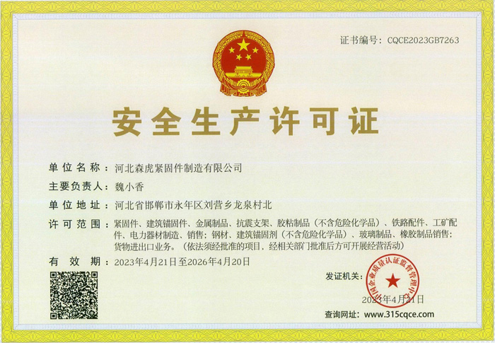 河北森虎緊固件制造有限公司成立于2011年,是建廠較早的緊固件企業(yè)。西臨京廣線(xiàn),東臨京深高速,地理位置優(yōu)越,交通便利。 主要生產(chǎn):化學(xué)錨栓、機(jī)械錨栓、定型化學(xué)錨栓、高強(qiáng)度8.8級(jí)化學(xué)錨栓、自切底機(jī)械錨栓、車(chē)修壁虎,膨脹螺栓,植筋膠。 質(zhì)量方針:先進(jìn)技術(shù)、科學(xué)管理、優(yōu)良品質(zhì)、用戶(hù)滿(mǎn)意; ...資質(zhì)榮譽(yù)